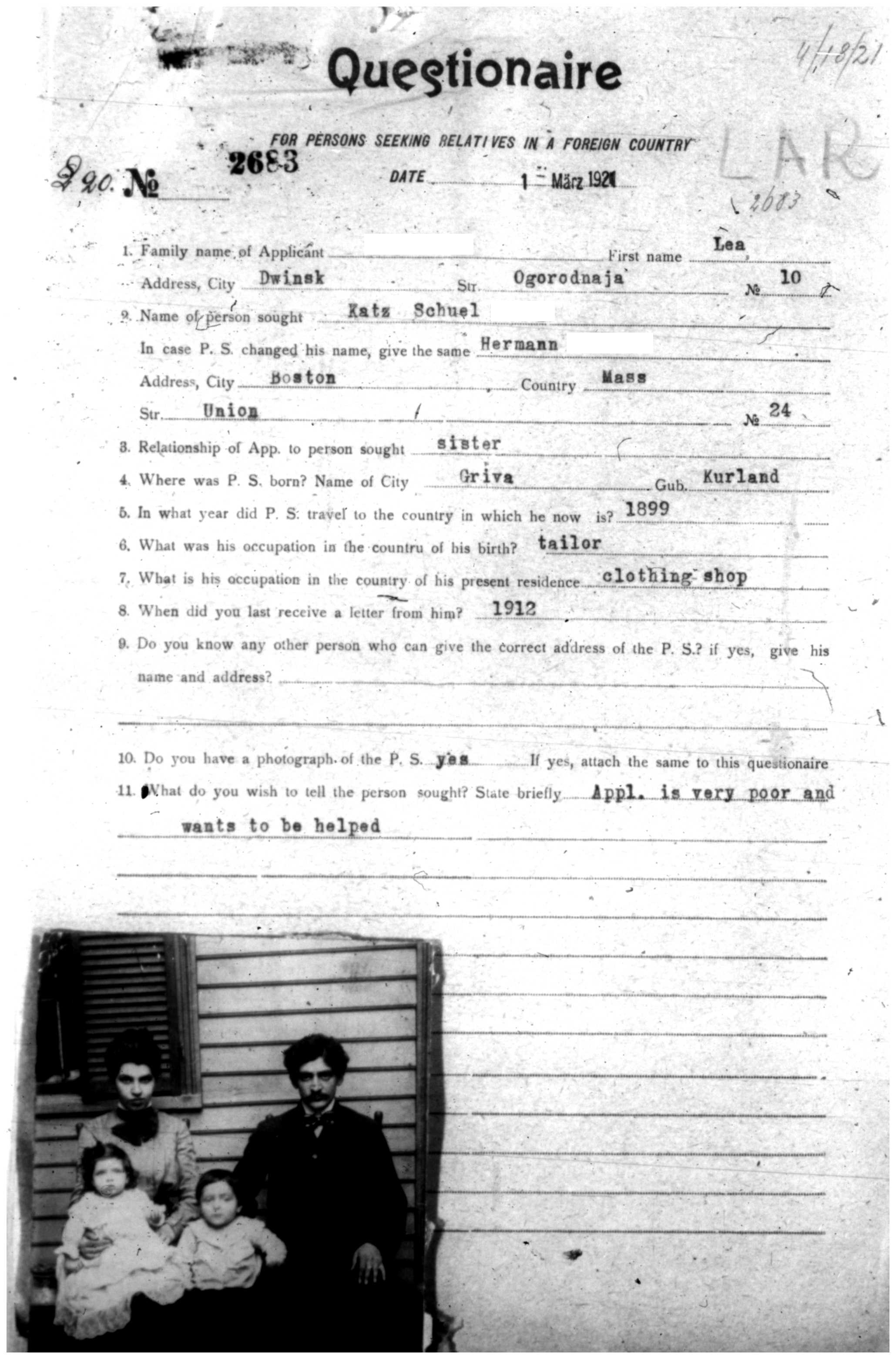 In 1921, the American Jewish Joint Distribution Committee established a Search Department to help World War I refugees from Eastern Europe find relatives in the United States and other countries. The Department’s records are comprised of questionnaires filled out by individuals seeking to locate relatives in the United States.